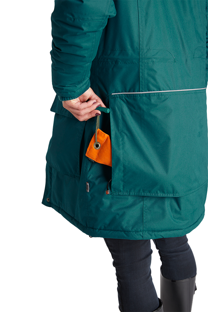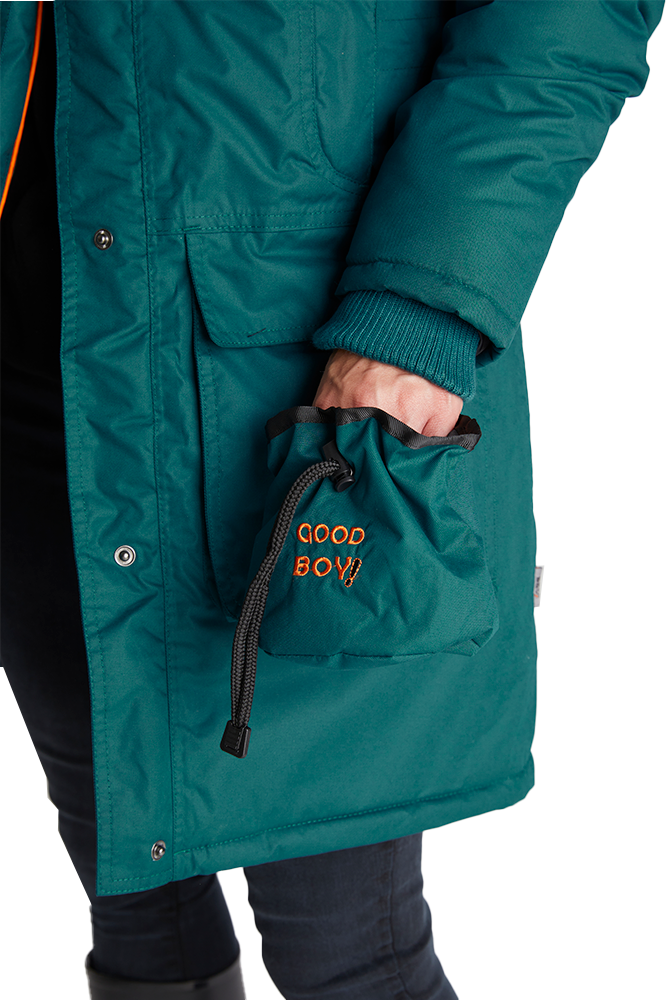 Modischer Winter Kurzmantel, wasserdicht 10.000 mm, atmungsaktiv, winddicht mit der GOOD BOY! Ausstattung - 2 Leckerlibeutel: 1 x am Karabiner (TIKA) und 1x mit Klett (FELIX) zum Fixieren an verschiedenen Positionen!