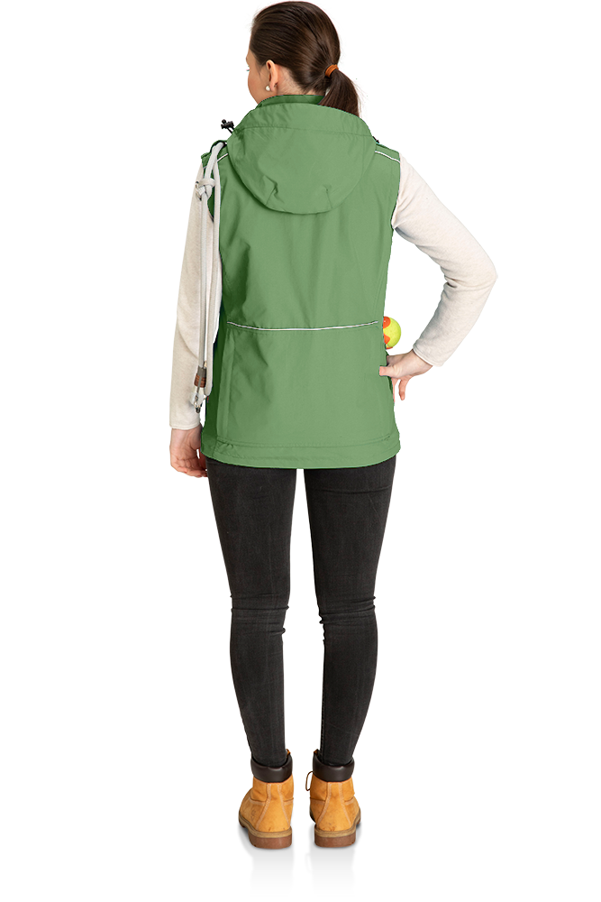 Eine leichte Damenweste mit extra vielen Taschen und Kapuze.