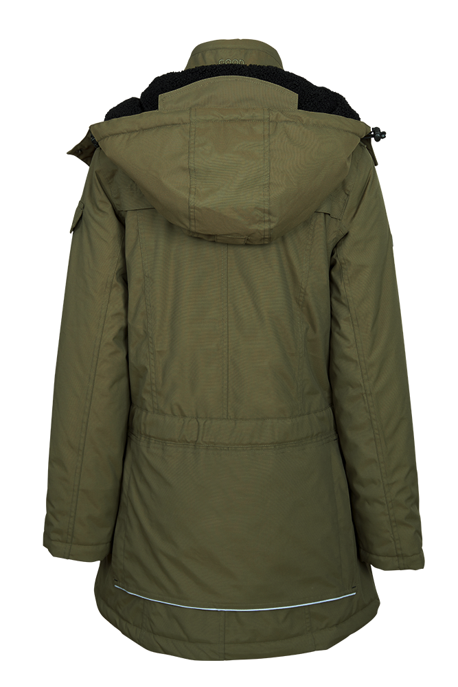 Nylon, 12.000 mm Wind- und wasserdicht (verschweißte Nähte), atmungsaktiv mit einer Kapuze aus Teddy-Fleece und einer wärmenden Wattierung. Perfekt für die kalten Tage im Winter. Natürlich bei 30° waschbar.